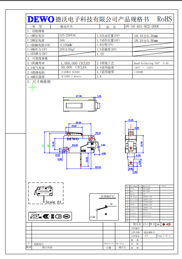DV-16-A01-NZ2-200E-W型微動開關(guān)